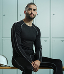 92% recycled polyester/8% elastane. Finished with added stretch for comfort. Quick drying and wicking performance fabric. Designed to be worn next to the skin. Self fabric collar. Featured stitching. Twin needle sleeves and hem. Cut out label.
